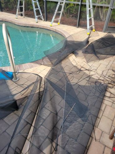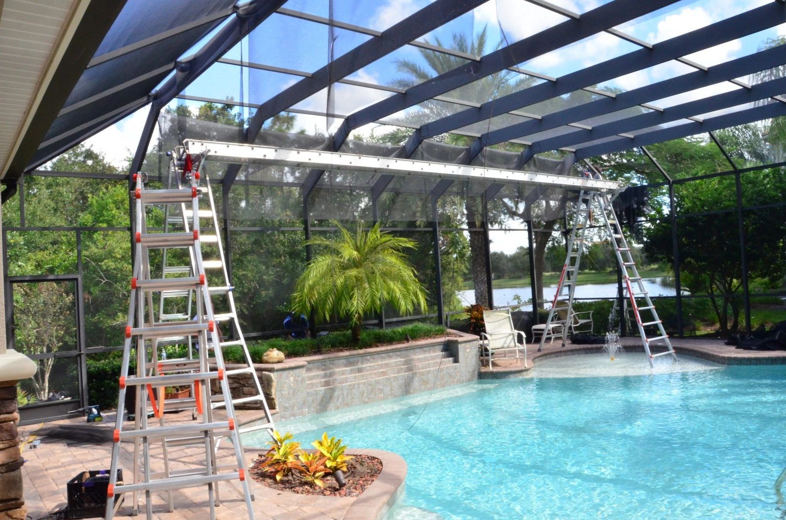 Pool cage refurbishing is sometimes necessary for worn or weathered cages. We offer full service refurbishing which may include, pressure washing and stripping the frame, replacing hardware and then applying new screen panels.